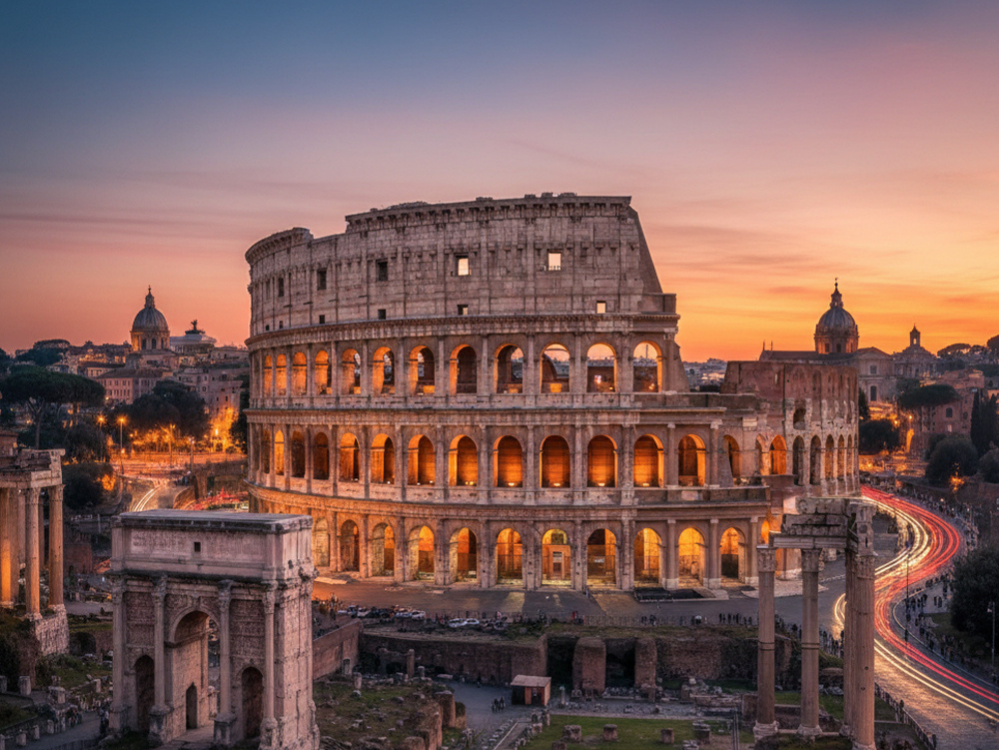 • Rome: Colosseum, Roman Forum, Trevi Fountain, Piazza Navona